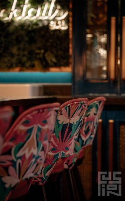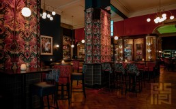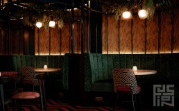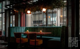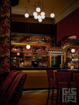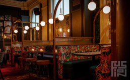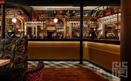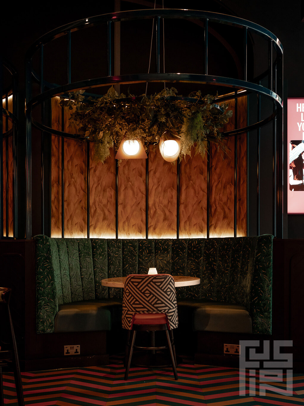 Surrounding the bar, customers can enjoy a variety of seating experiences. Bespoke framed booths with pendant lighting and lush green foliage provide intimate settings, while bold wallpapers paired with sumptuous fabrics in pink, teal, gold, and deep blue introduce richness, pattern, and texture throughout.