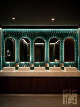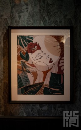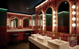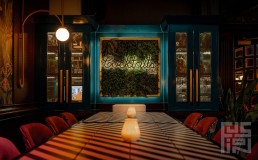 At the heart of the venue sits the dramatic bar servery, taking centre stage with illuminated arched display cabinets, reeded panelling finished in gold, and an eye-catching mural graphic. This bold focal point is both a showcase and a stage for the team to craft the brand’s signature cocktails.