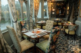 In the rear dining area, patterned wallpaper and feature fabrics bring depth and sophistication, complemented by antique mirrors and statement lighting that add reflection and texture. The front dining space and conservatory adopt a lighter, brighter palette yet maintain cohesion through a unifying foliage motif and consistent finishes.