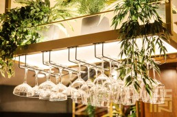 The main bar serves as the social heart, featuring a 3D green-tiled front, dark walnut-stained reeded timber, and gold powder-coated overbars. Rich marble tabletops, deep fabrics, and warm amber lighting add intimacy, while trailing foliage introduces vibrancy.